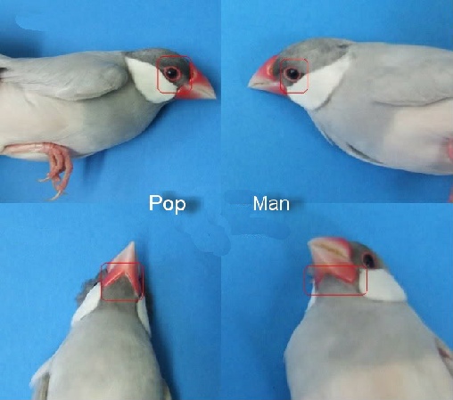 Poppen hebben een wat meer puntige snavel (zie links op de foto) en mannen een wat kortere stomper snavel die aan de ondezijde meer afgerond is (zie rechts op de foto)